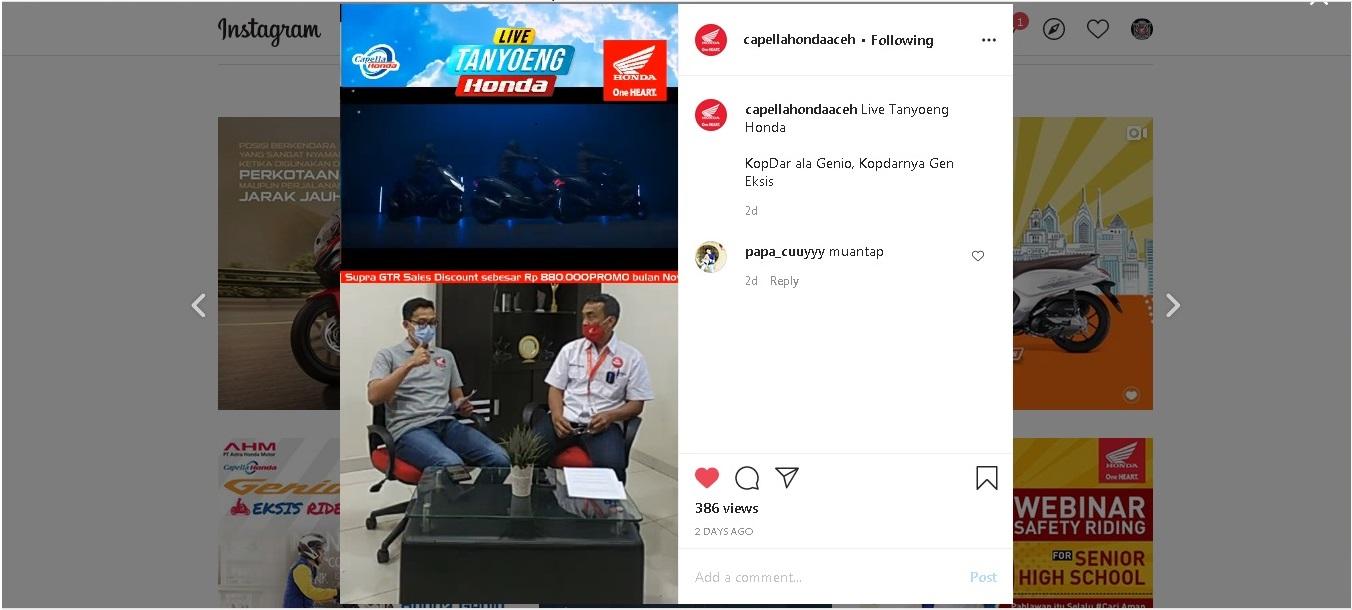 PT. Capella Dinamik Nusantara (Capella Honda) Aceh mengajak para bikers yang ada di Aceh, untuk melakukan kopdar online melalui Instagram dan zoom. Kegiatan yang dilaksanakan pada 6 November 2020 ini, sangat menarik bagi para bikers, karena bisa silaturahmi dengan bikers di luar wilayah Aceh juga.