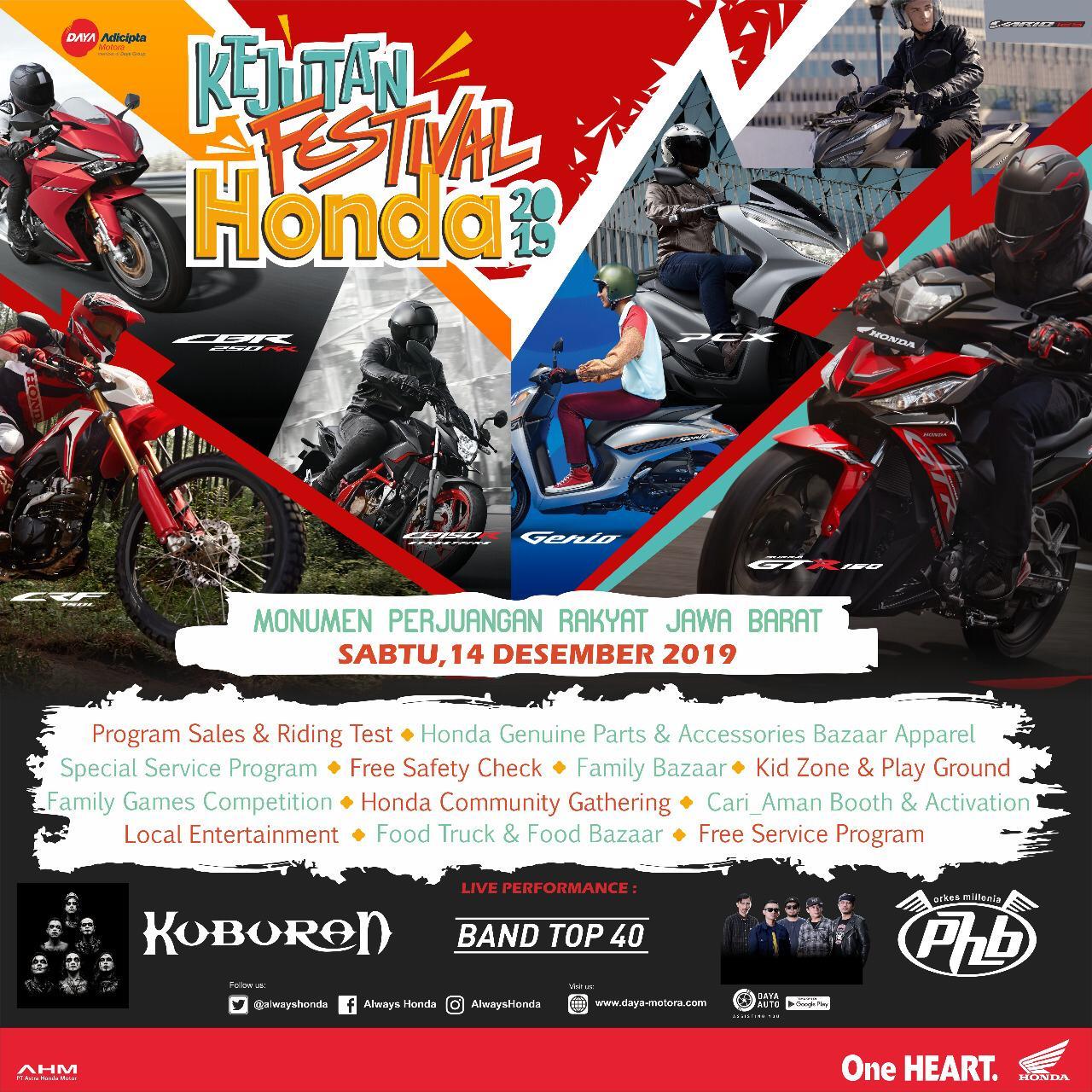Menyambut akhir tahun 2019, PT Daya Adicipta Motora (DAM) selaku distributor utama sepeda motor dan suku cadang Honda di Jawa Barat menggelar acara Kejutan Festival Honda yang berlangsung di Monumen Perjuangan Rakyat Jawa Barat pada 14 Desember 2019.