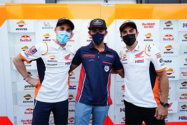 Kawan-kawan.... Pebalap Astra Honda Racing Team yang berlaga di FIM CEV Moto3 Junior World Championship, Mario Suryo Aji mendapat suntikan motivasi langsung dari pebalap MotoGP menjelang balapan di Misano World Circuit Marco Simoncelli, Italia (17/9). Dua pebalap Repsol Honda Team, Marc Marquez dan Pol Espargaro, yang balapan di ajang balap dunia MotoGP memberikan semangat pada pemuda asal Magetan, Jawa Timur ini agar tidak pantang menyerah dalam memperjuangkan mimpinya.