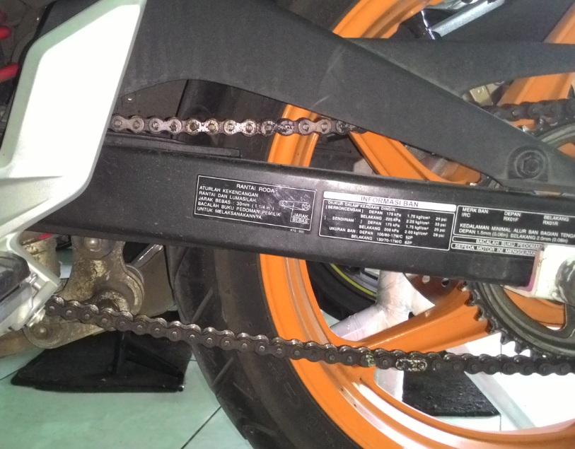 Maka itu, bagi para bikers disarankan sekali untuk rajin-rajin mengecek kondisi rantai. Jika rantai kotor, maka harus dibersihkan memakai cairan penetran dan dilumasi pakai chain lube. Sementara jika rantai kendur, ketegangannya wajib disetel ulang. Pabrikan merekomendasikan jarak main bebas rantai motor antara 2-3 cm.