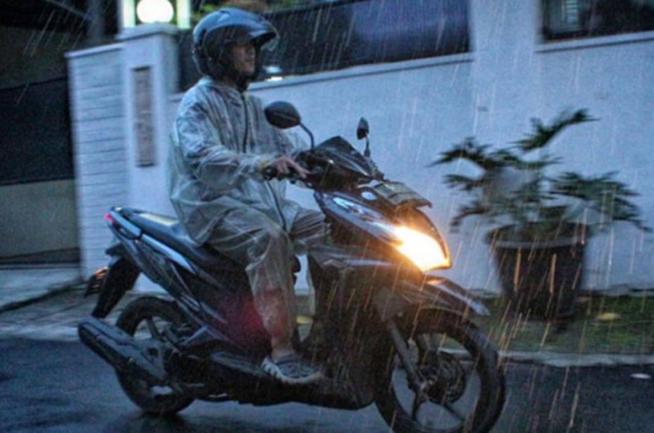 Ketika hujan mulai gerismis selain menggunakan jas hujan, bawa motornya juga beda. Lebih hati-hati. Selalu waspada dengan situasi sekitar.
