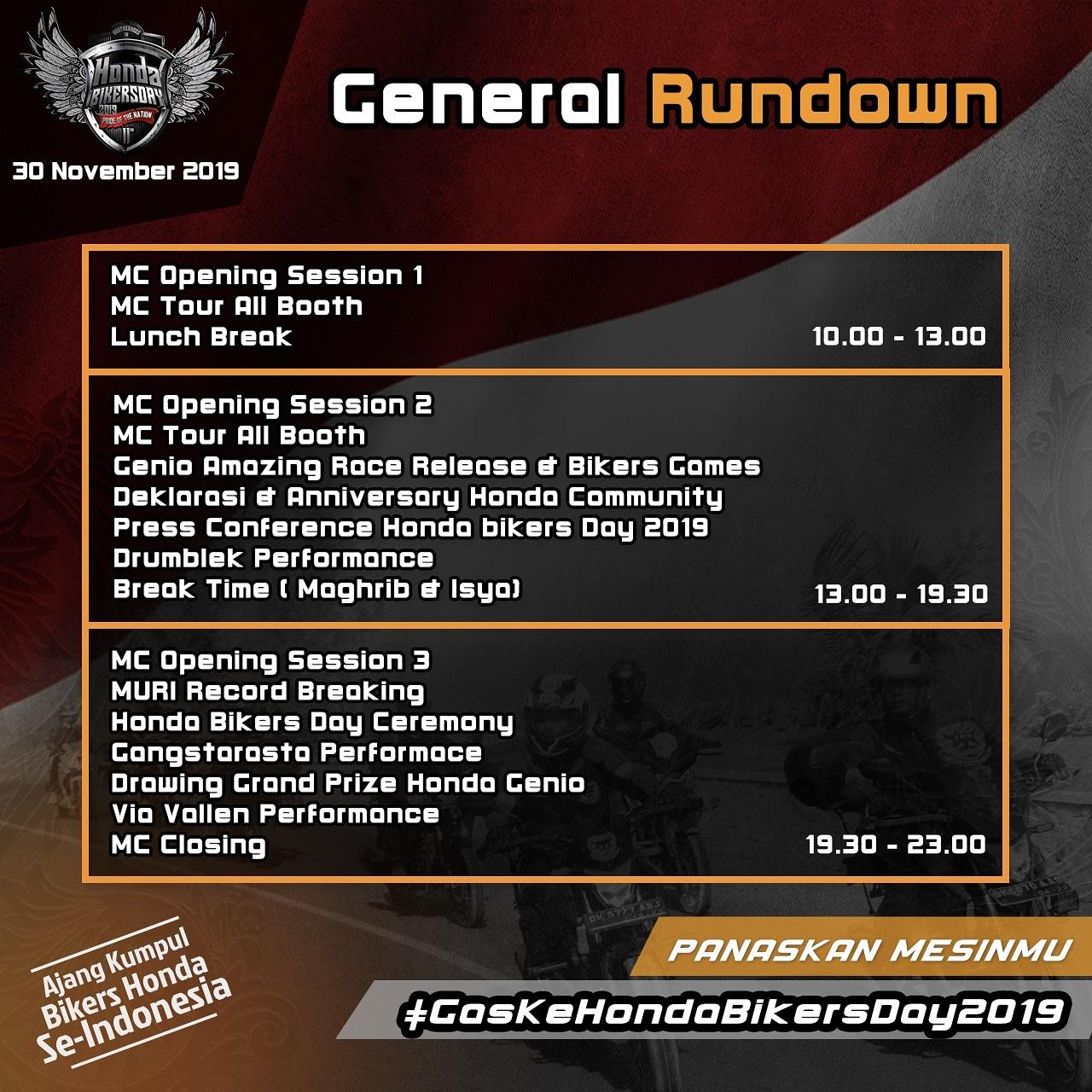 Berbagai acara akan mengisi kegiatan Honda Bikers Day 2019 ini termasuk di didalamnya adalah acara pemecahan rekor Muri dan di acara puncak para bikers akan dihibur oleh Via Vallen di panggung utama.