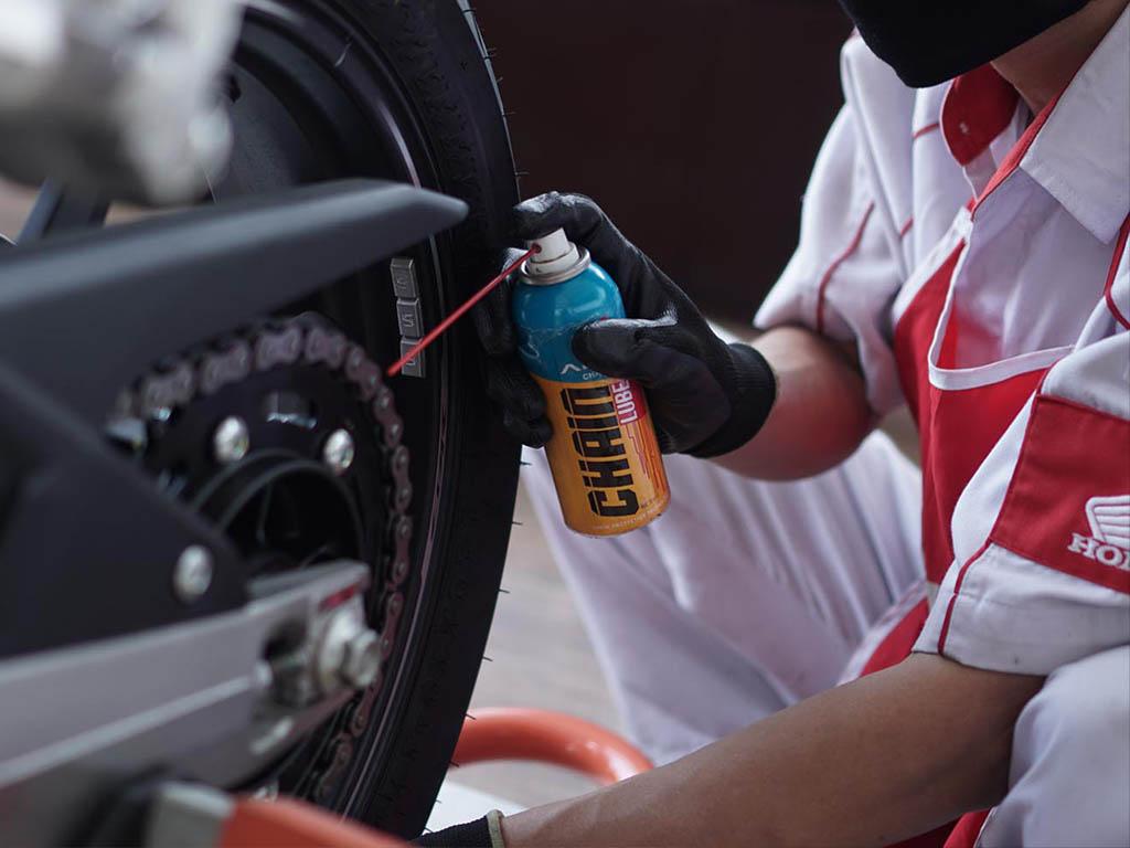 Selalu memberikan pelumas pada rantai roda tujuannya adalah agar tetap awet. Pelumas rantai roda ini berfungsi untuk melumasi rantai motor hingga ke celah mata rantai. Selain itu, pelumas juga membantu membersihkan rantai motor dari kotoran maupun debu yang menempel pada rantai. Jangan memberikan pelumas rantai dengan oli bekas, karena akan mengundang kotoran-kotoran yang akan menempel di rantai dan membuat rantai menjadi tidak awet. “Lebih baik menggunakan chain lube khusus, jika menggunakan sepeda motor Honda bisa memaki pelumas rantai AHM Chain Lube 70ML,” ujar Ade.