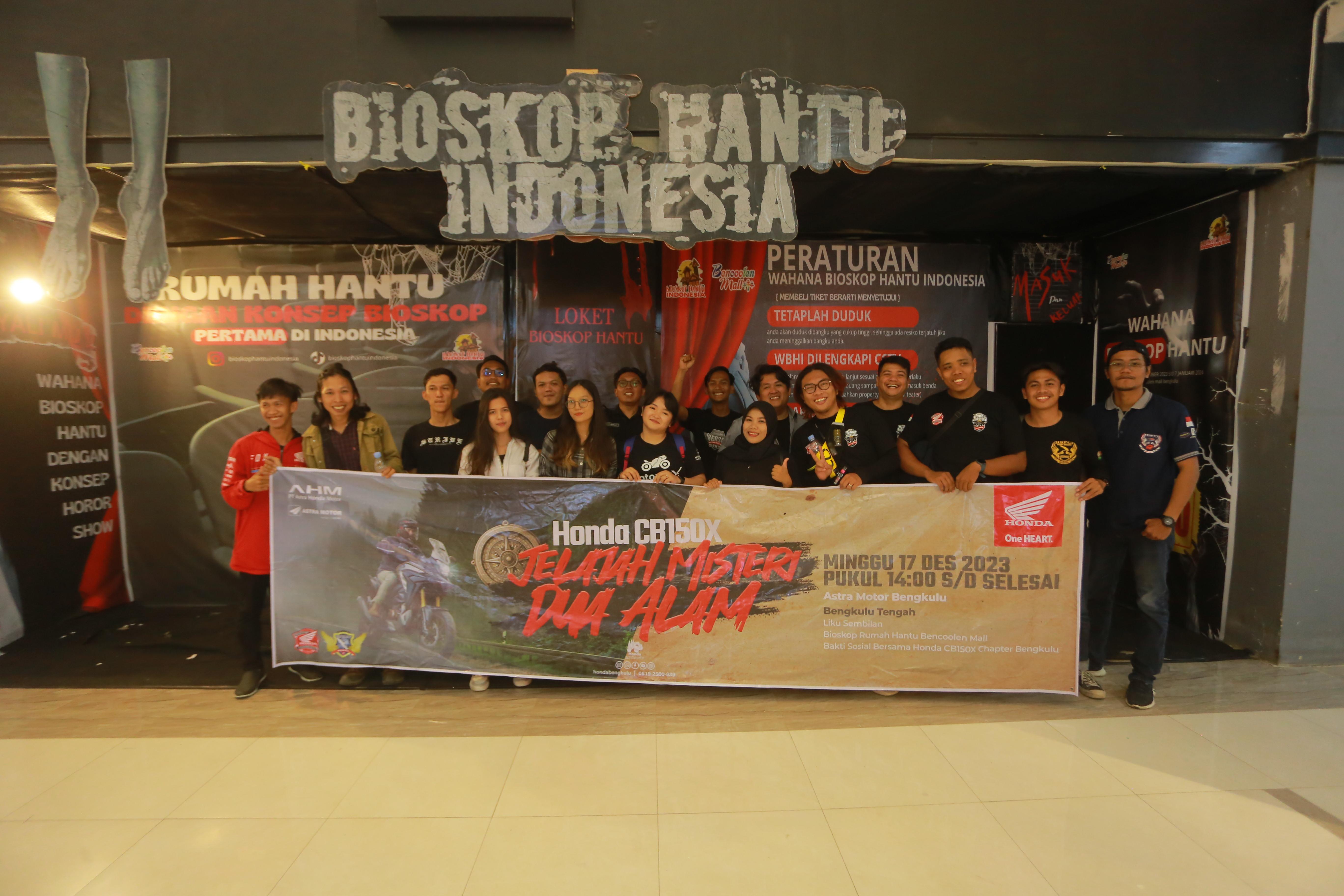 Bengkulu - Jelajah Misteri Dua Alam kembali di gelar oleh Astra Motor Bengkulu, Minggu (17/12). Berkolaborasi dengan Komunitas Honda CB150X Chapter Bengkulu, 25 bikers yang terlibat dalam kegiatan ini diajak untuk mengeksplore tempat wisata Liku Sembilan dan jelajah misteri di bioskop rumah hantu Bencoolen Mall.