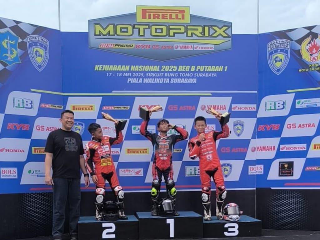 Surabaya – Mengawali musim balap nasional 2025, Honda Daya Jayadi Racing Team tampil penuh semangat di ajang Motoprix Region B Putaran Pertama yang digelar di Sirkuit Gelora Bung Tomo (GBT), Surabaya, pada tanggal 17-18 Mei 2025. Turun di dua kelas berbeda, tim balap binaan PT Daya Adicipta Motora (DAM) ini mengandalkan dua pebalap muda potensial, yakni Dafa Sagraha Kurniawan di kelas MP3 Rookie dan Agam Abdillah di kelas MP4 Beginner, dengan mengendarai sepeda motor Honda Supra GTR.